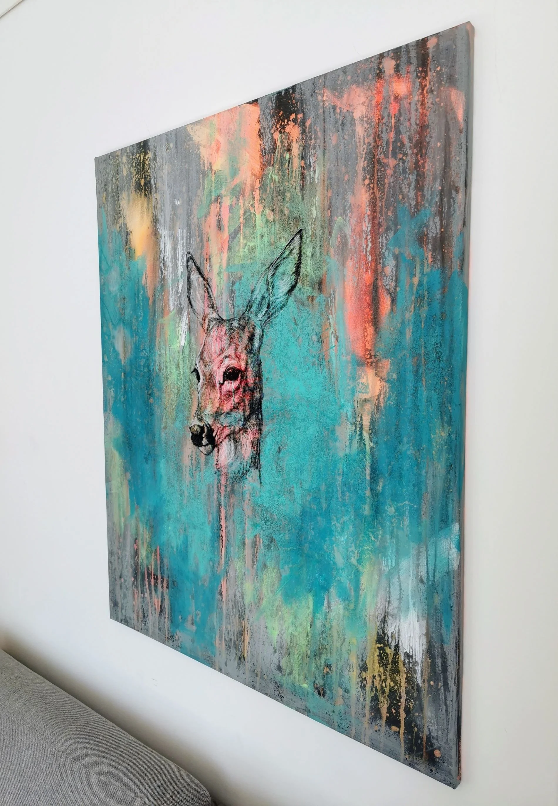 “Fawn” Akryl og kull på bomullslerret; 100 cm x 80 x 2 cm. Produsert August 2024. 12.000,-Kjøp maleriet